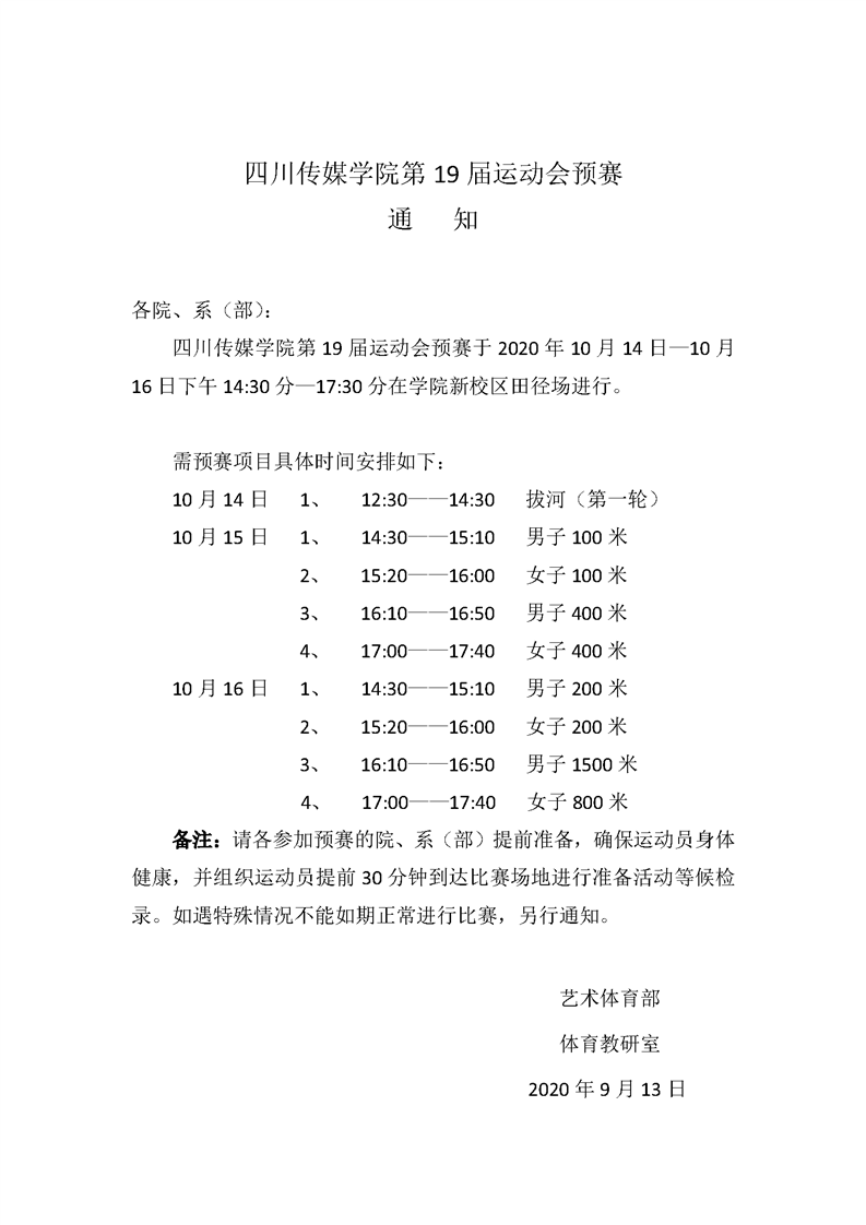 四川传媒学院第19届运动会预赛 通知