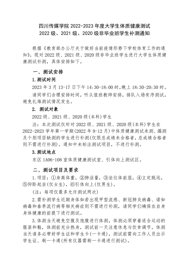 四川传媒学院 2022-2023 年度大学生体质健康测试 2022 级、2021 级、2020 级非毕业班学生补测通知
