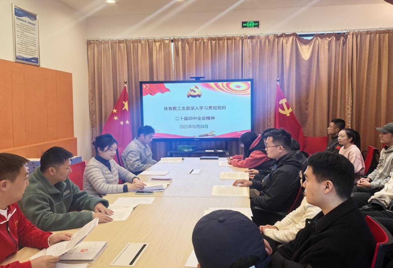 10月24日,体育教工支部在游泳池会议室召开专题学习会,集中学习党的二十届四中全会精神,会议由教工支部书记陈朝晖主持,体育部全体党员教师参会。