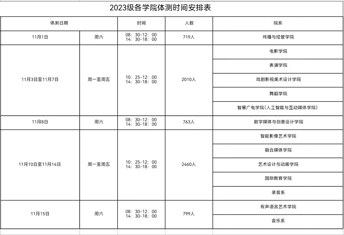 关于2023级各学院体测时间安排的通知