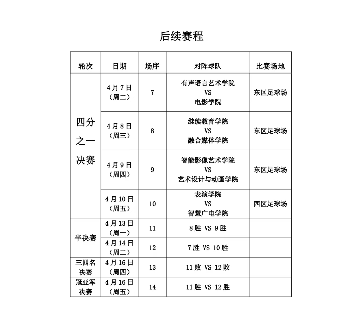 后续赛事中,期待各支参赛球队继续发扬拼搏精神,在绿茵场上赛出水平、赛出风格;也欢迎全校师生持续关注赛事、走进赛场,共同感受体育运动的魅力,共享四月体育月的活力与精彩。